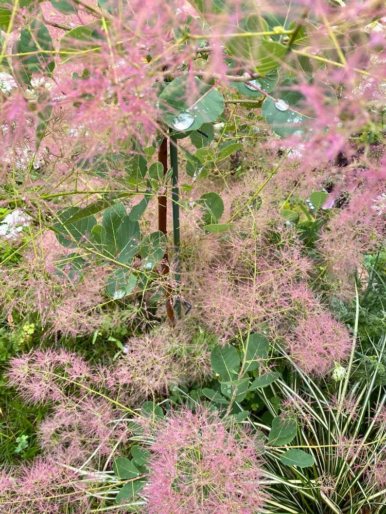雨がスモークツリーの葉の上で弾いてまとまり、ジュエル💎のよう