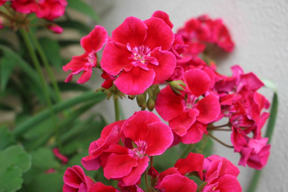 濃いピンクと赤の華やかなゼラニウム、玄関前で咲いています✨