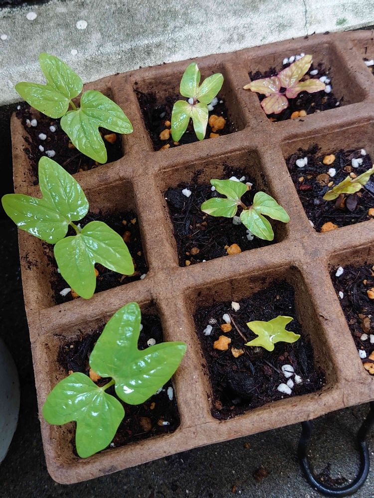 朝顔が溢れ種から発芽している…3つも…と思ったら、どうやら雑草のヒルガオかも🤣です😆