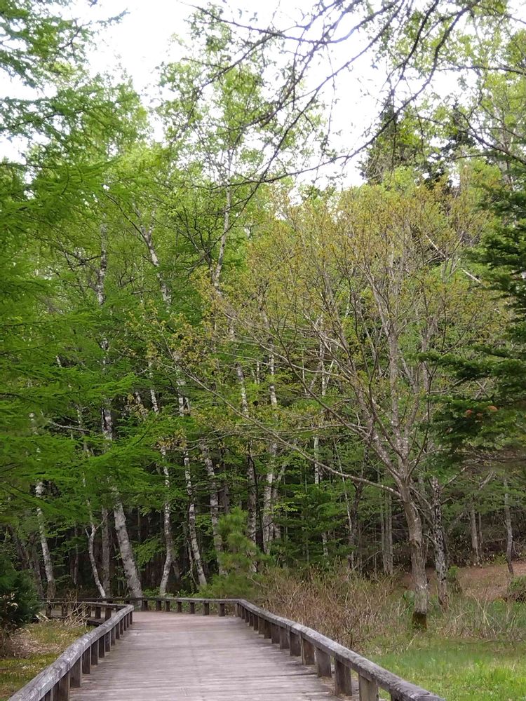 乗鞍高原の朝の散歩ガイドさんの案内で牛留池に向かう木道です