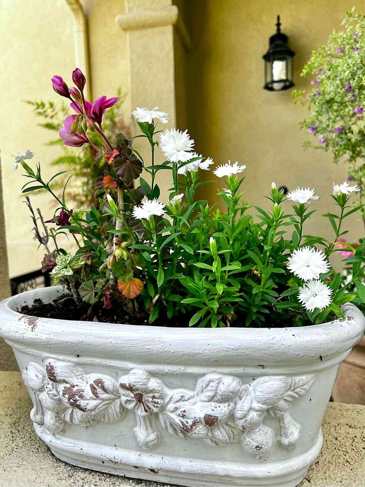 玄関に置いているダイアンサスとゼラニウムの寄植え💕冬はか弱くなっていましたが💦迷わず水やりを続けたらこちらもなんとか復活✨