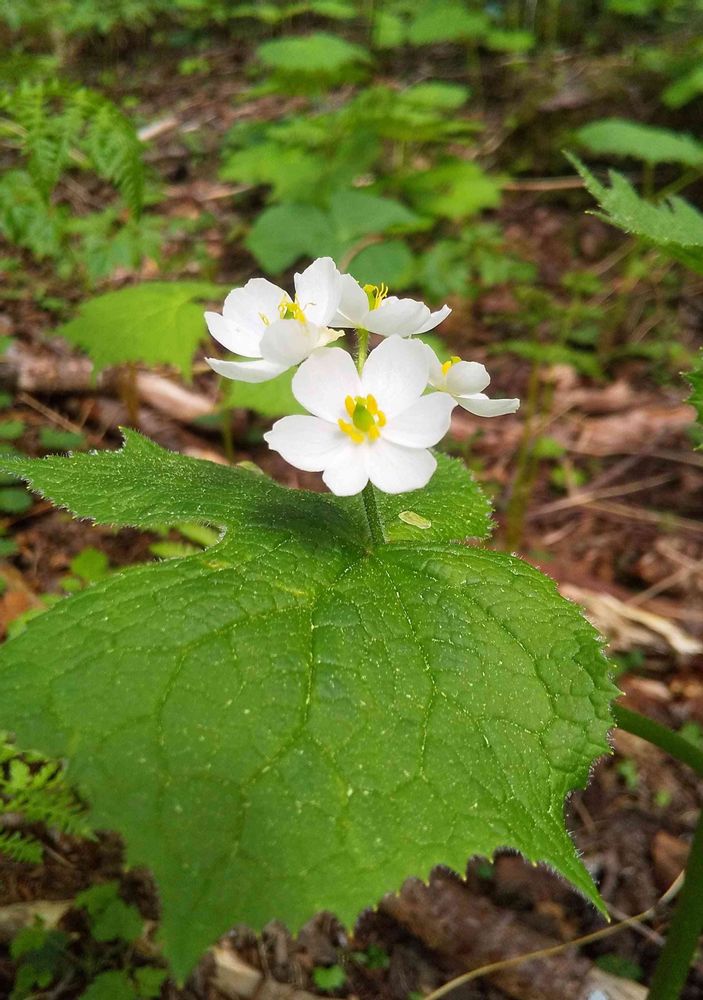 大きな葉の上に2cmほどの小さな白い花をブーケ状に咲かせるサンカヨウ🌼☘️