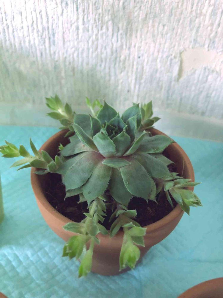 センペルビウムですね。基本的には関東以南でしたら氷点下にも耐える強い子です。今は日差しが足りずに親株もランナーの子株も徒長してしまっているので良かったら日差しが届く場所か、もっと明るい場所に置いてあげてください。ただし、真夏は午後の強い日差しを避けるようにしてください。土は多肉用で大丈夫ですよ。サボテン用だと肥料が一切入っておらずとにかく水はけ重視で多肉にとっては乾きやすいこともあるので要注意です。また、鉢が100均のテラコッタに見えますが、とても乾きやすいので、水やりペースは週1か、もう少し速いペースが目安です。