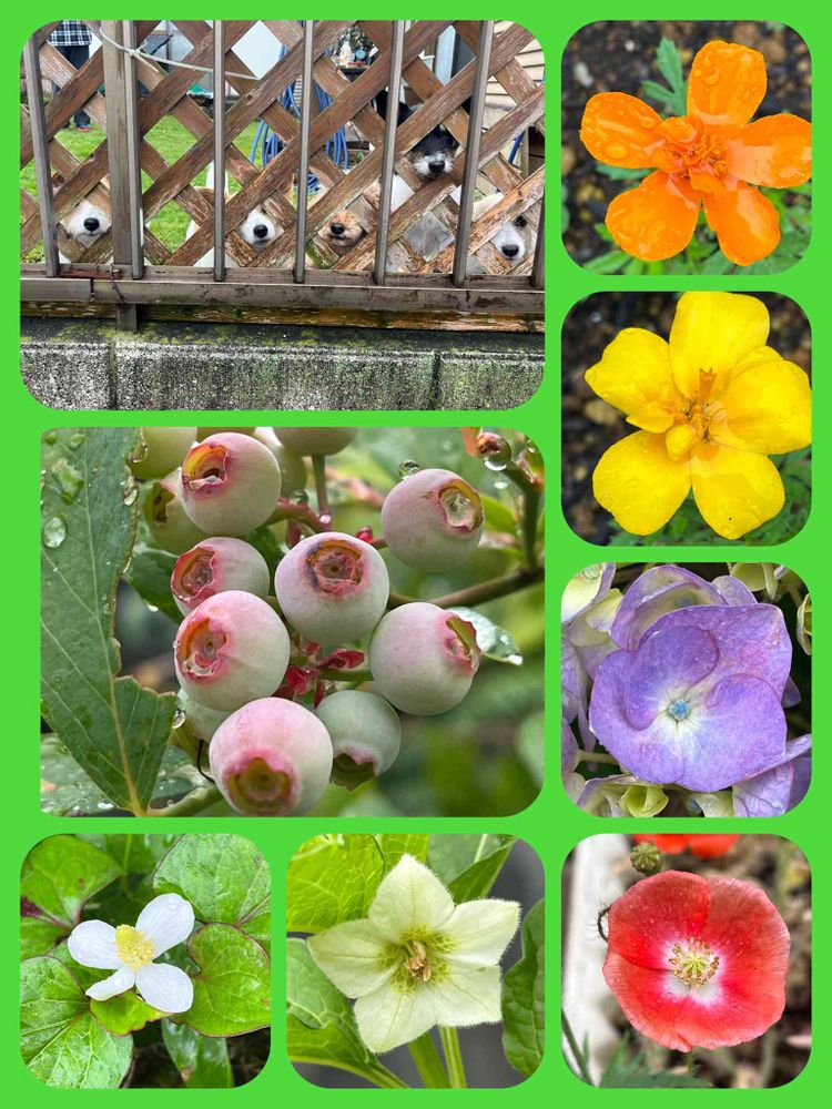 おはようございます。曇り、17.6℃、8:40ちょうどいい。小雨が止んだ合間にお友達とのオヤツ交流です。ブルーベリー🫐の実も膨らんできました、先日、孫が🟣になったら採るんだよ!と教えてくれました。マリーゴールド、オレンジ/イエローの小さな花咲いてくれました。紫陽花、ガク(装飾花)を分け入ったら小さな白い蕾がありました。ポピー、赤い小さな花が咲いてます、次は種採りです。ホオヅキ、花まだ咲いてます、実も膨らんできてます。隣りの空き地、草刈りしたのにドクダミの花が咲いてます。🥰😻😍😸☺️😋
