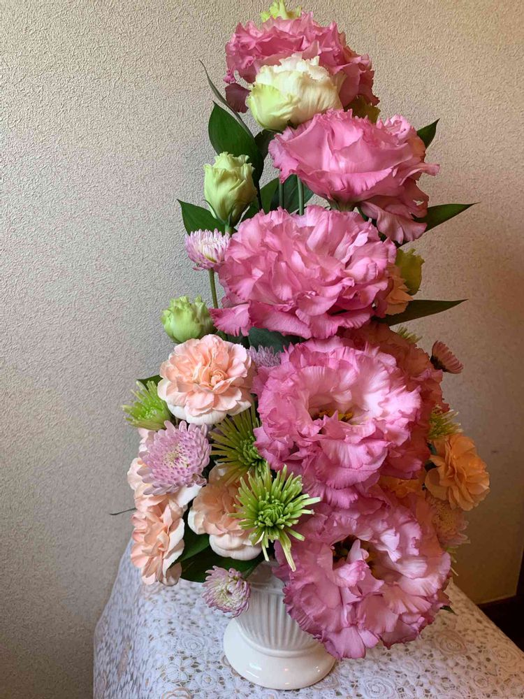 ピンクのトルコキョウが縦一列に配置されていて可愛いアレンジメント、パーテイカルです💐