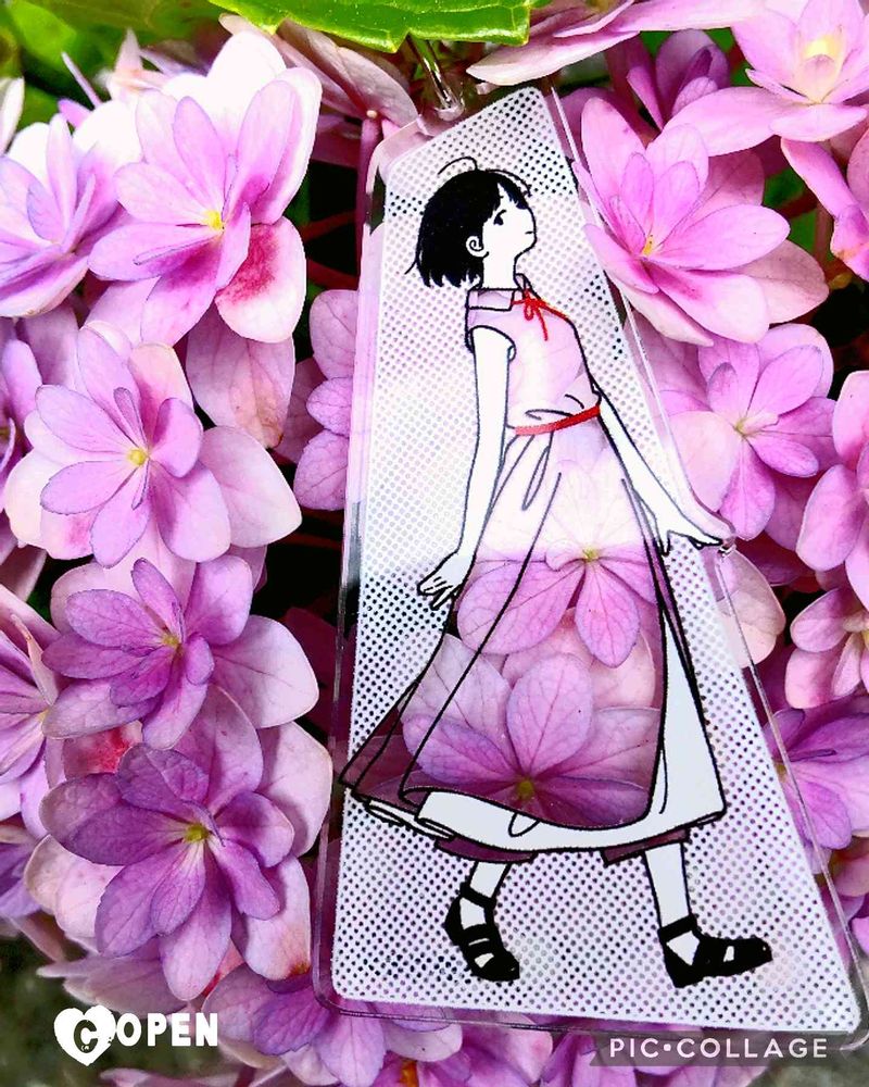 カラフルな彩りと花姿で、楽しい演出をする紫陽花と、お散歩キーホルダーがマッチして、より一層楽しい雰囲気の世界を作り出している