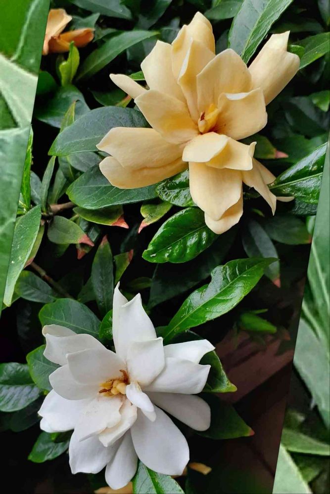 クチナシは白が多いと思っていました。白と黄色の2種類が咲いているなんて 香りは同じなのでしょうかね😃