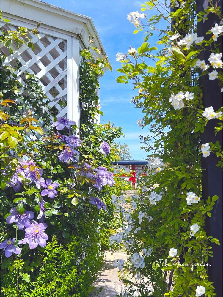 バラとクレマチスに囲まれた小径 とってもステキです♪お庭のお世話もここで癒されますよね(^。^)
