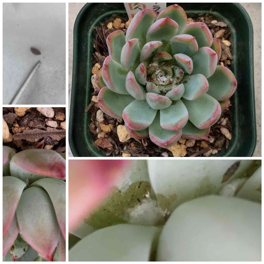 プリラータさんが虫害に合いました。白い綿がついていて、私はカイガラムシを見たことがないので、カイガラムシ??と調べましたが、出てくる画像は白い虫。うちのは左上の紫色っぽい虫でした。