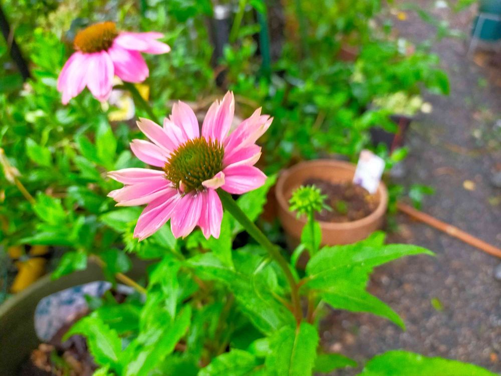 雨降りの中庭のエキナセアを