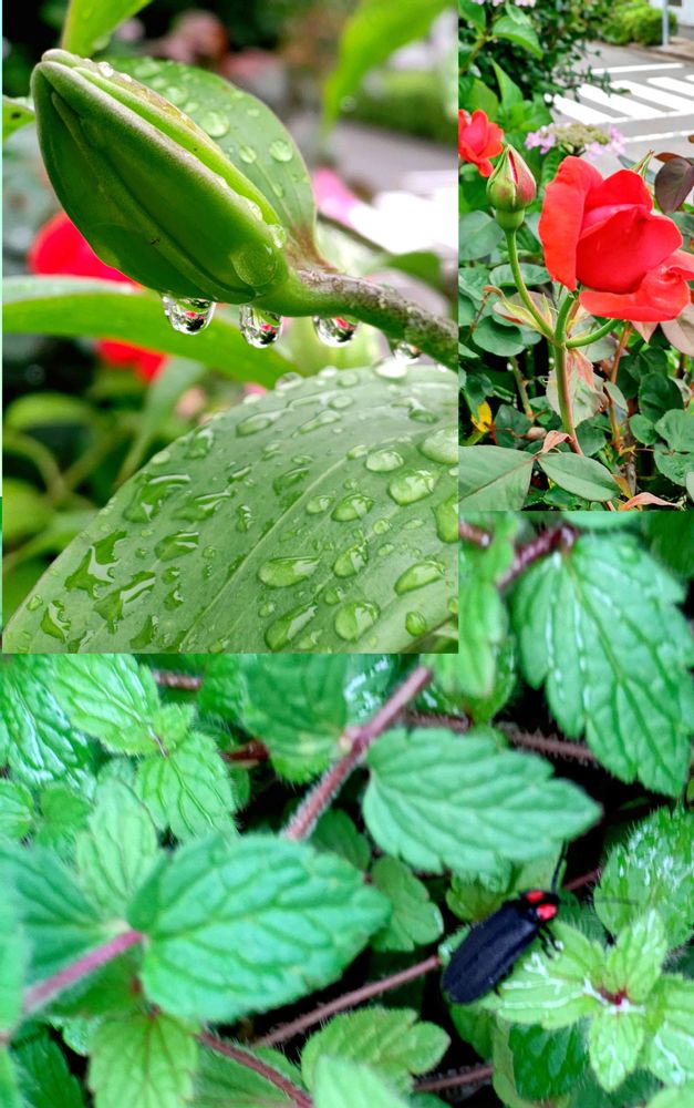 ユリの葉っぱに付いた水滴と薔薇の花がいい感じでした🐸♥