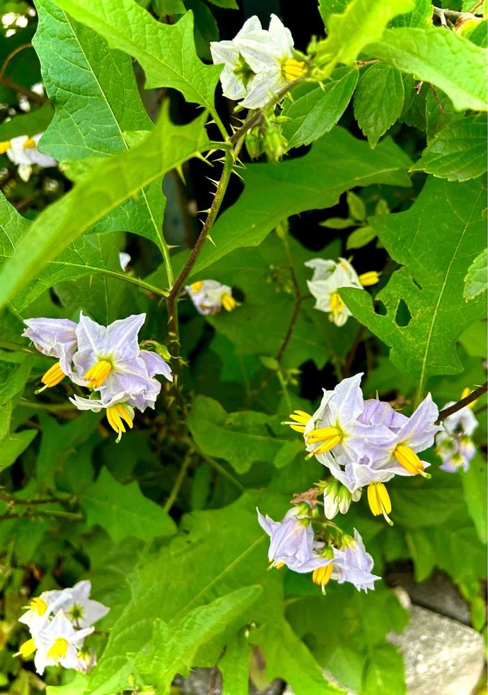 ワルナスビ🍆、なんでそんなネガティブな名前なの(*´ω`*)。花はかわいいけどトゲがすごい( >﹏< *)茎だけじゃなく葉の裏も!ワルイコあつまれ‼️牧野先生の命名の雑草は絶妙なセンス😭