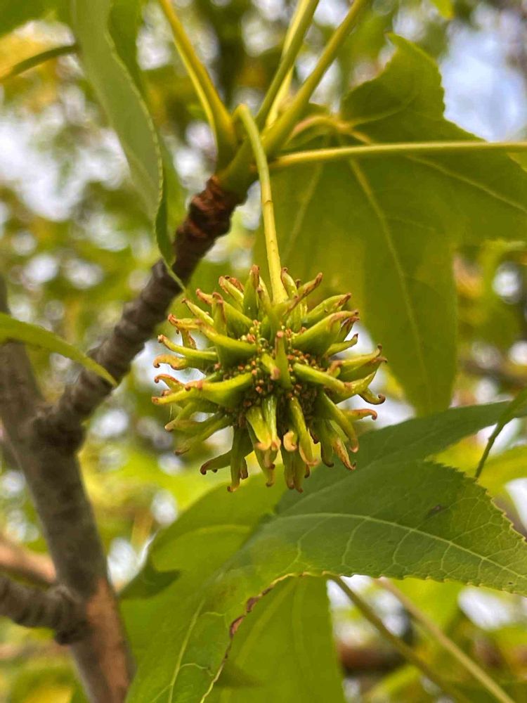 中国を原産とするタイワンフウの仲間で、タイワンフウは葉が3つに裂けるが、本種は五つに裂けてモミジ(カエデ)のように見えるため、モミジバフウと呼ばれる。