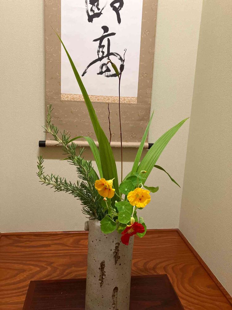 掛け軸床の間に筆の花器にしっくりマッチした生け花ス🩷テ🧡キ