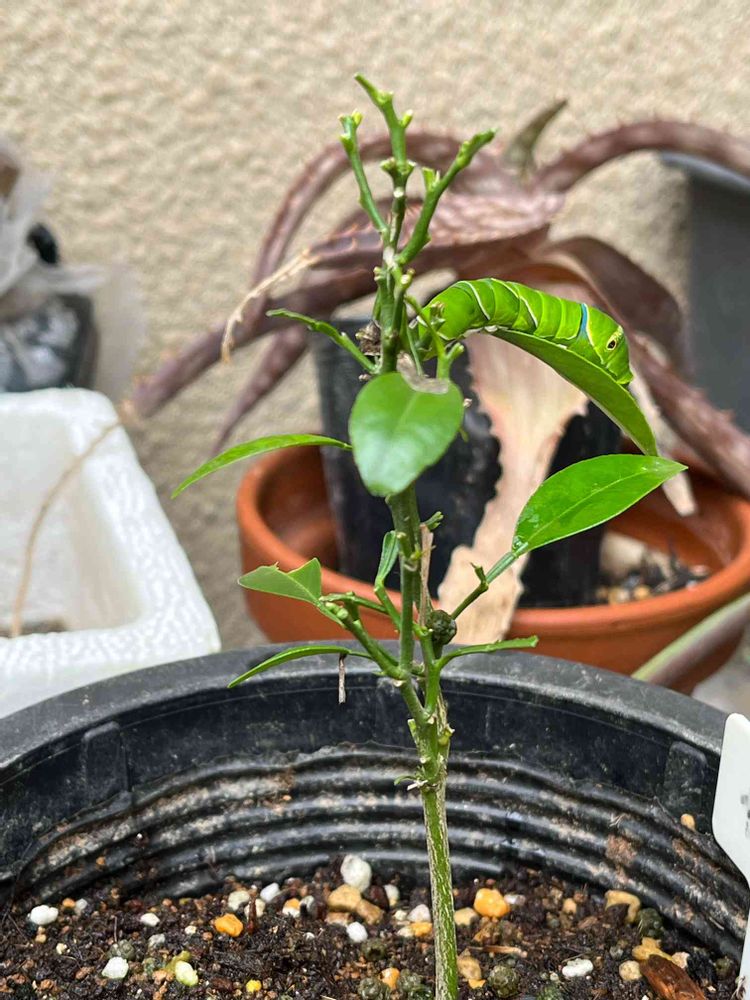 甘夏の苗木がいつの間にかアゲハの幼虫🐛に裸にされていました😂