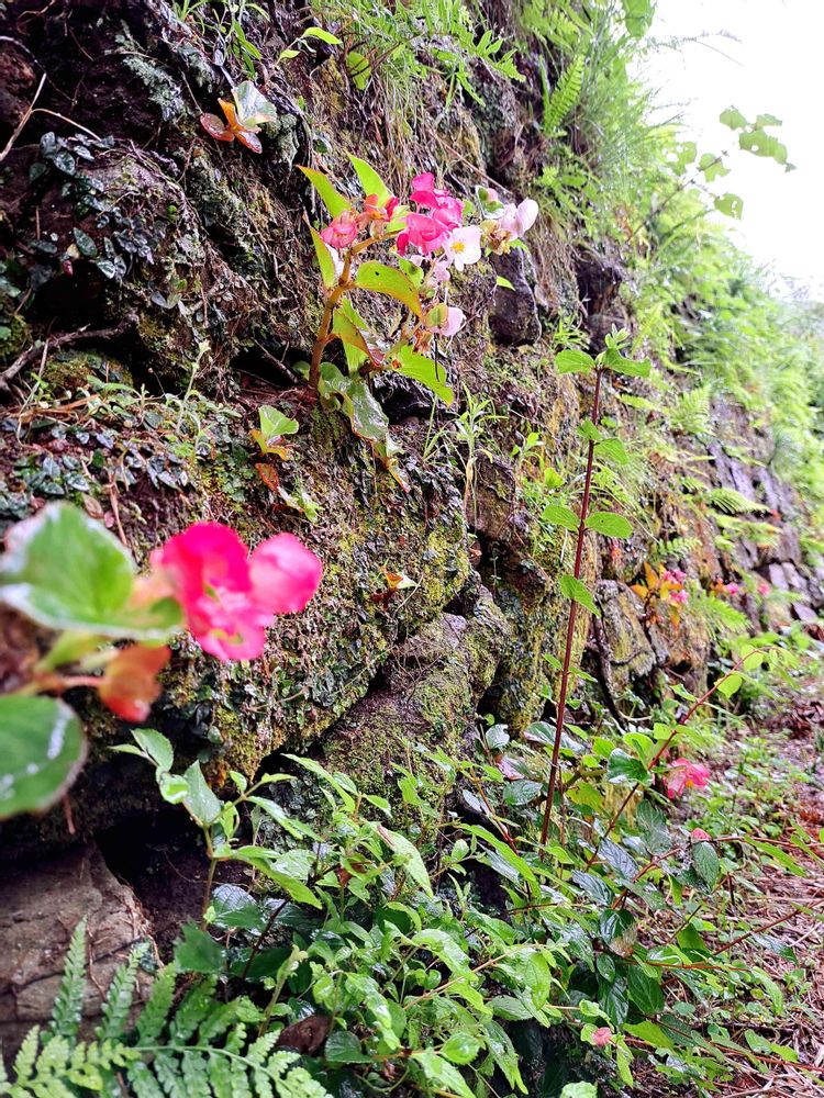 母が、ベゴニアを刺してこうなったのか?… 石垣からベゴニアを覗かせている小路、こちらへんではよく見かけるよ〜