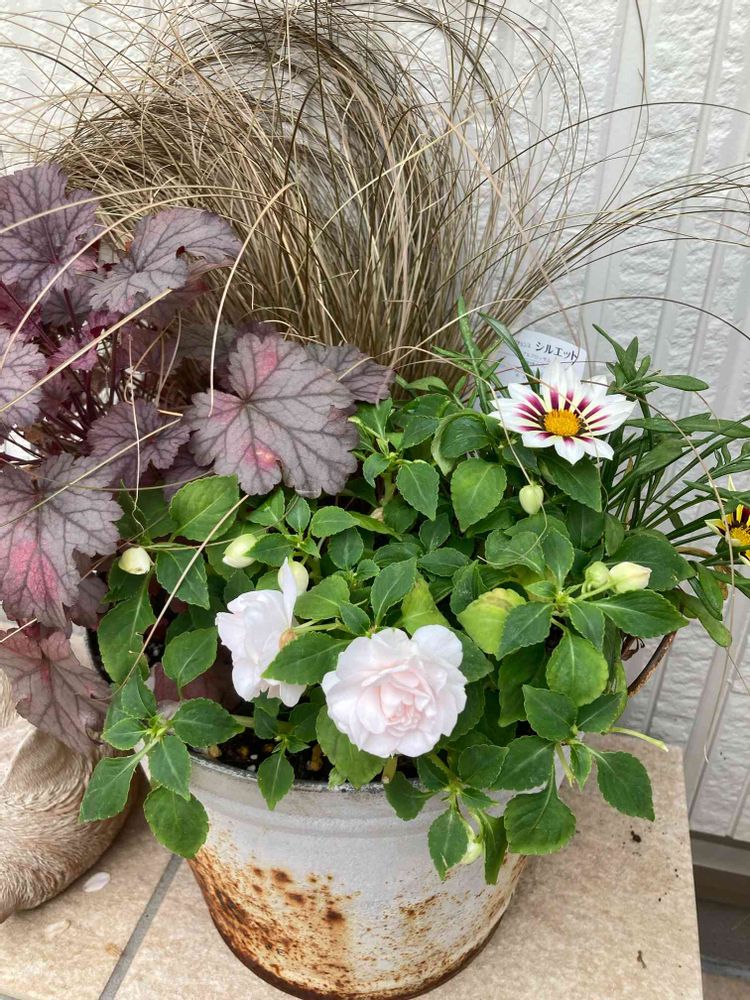 北玄関のため日当たり悪いけど花飾りたいということで、インパチェンスとあり物で寄せ植えしてみましたが…少し地味になりました…