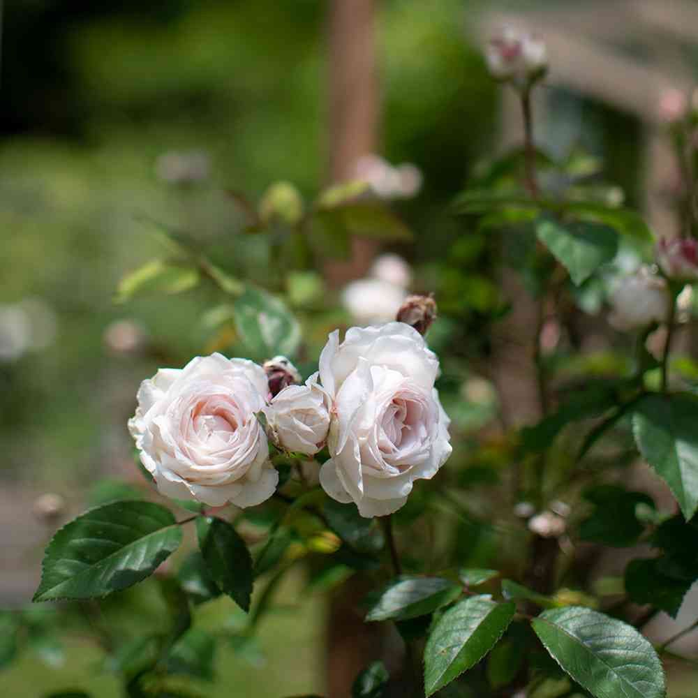 粉粧楼咲き始め。今年は雨除けを作ってもらったおかげで、ボーリングもなく咲きそうです。