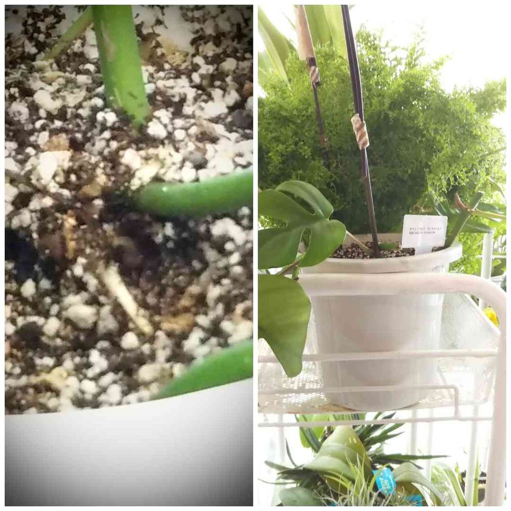 その茎を鉢の縁を支えにして、挿し木。3週間ぐらい経過している。今日は、いつもより強めの水圧になってしまった水遣りの結果、根を発見🤓