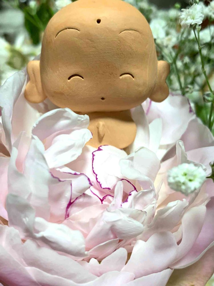 ゆいちゃん、このお地蔵さんと芍薬のお花、さっき知り合いにいただいたのー。