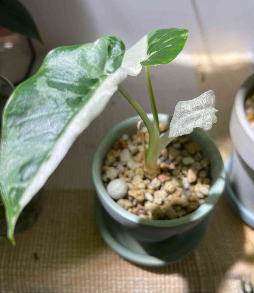 ちび斑入り食わずいも、順調に育っています。この白いお化けちゃんは、フローズンクイーンのように、透かしが入っているように見えます。ちびちゃいからかなぁ😊