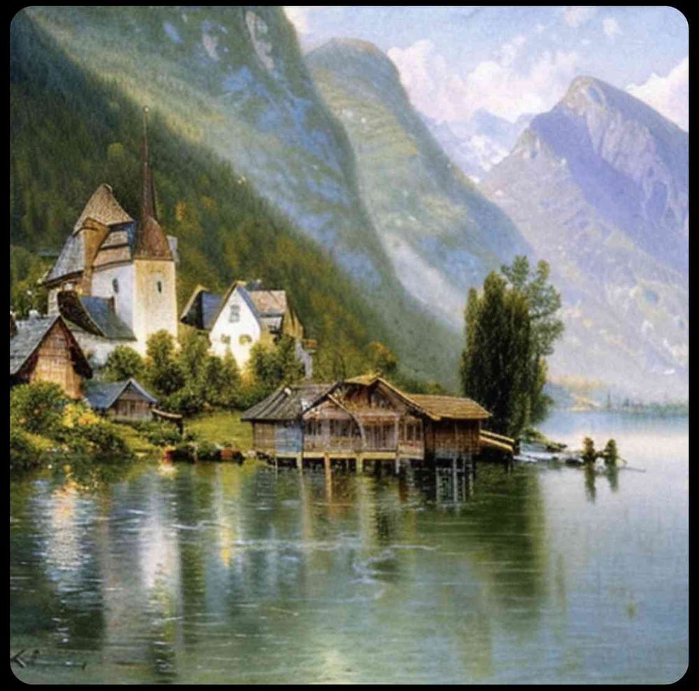 高解像度, 透明水彩, 緻密で美しい水, 超細密, 幽玄的, 一番最初, ヨーロッパで最も写真に撮られた場所”とも呼ばれる湖畔の街, 16世紀に建てられたアルプスの家々, ハルシュタット,オーストリア,イワン・クラムスコイ