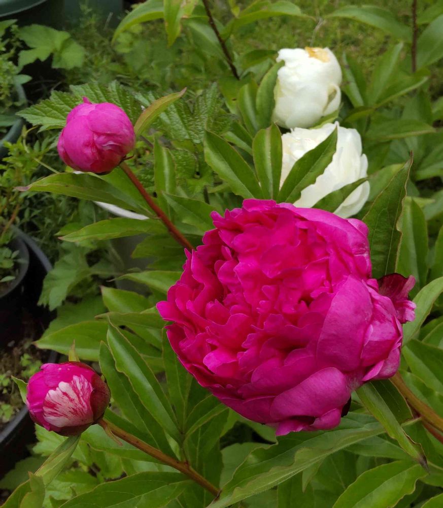 濃いピンクパープルの八重咲きの芍薬💓とまんまるの蕾たち🟣⚪🌿