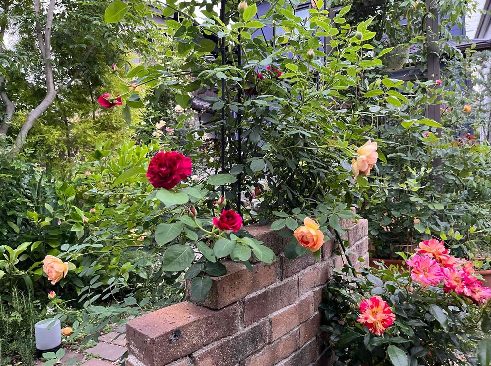 昨夕の一枚。今になって咲いてきた、レンガ壁の一角。