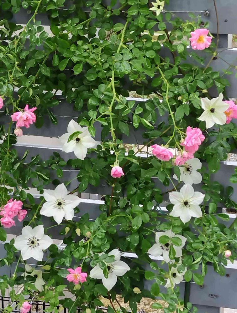 昨日蕾だけ残して✂した西側パーゴラのドロシーパーキンスの壁面でこんなところにもクレマチスがあったの⁉とクレマチスサニーサイドが咲き出しました😅