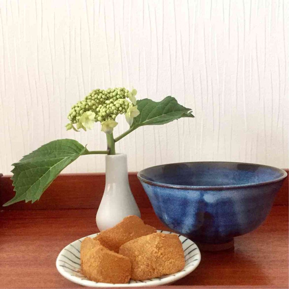 青い抹茶茶碗とわらび餅で。