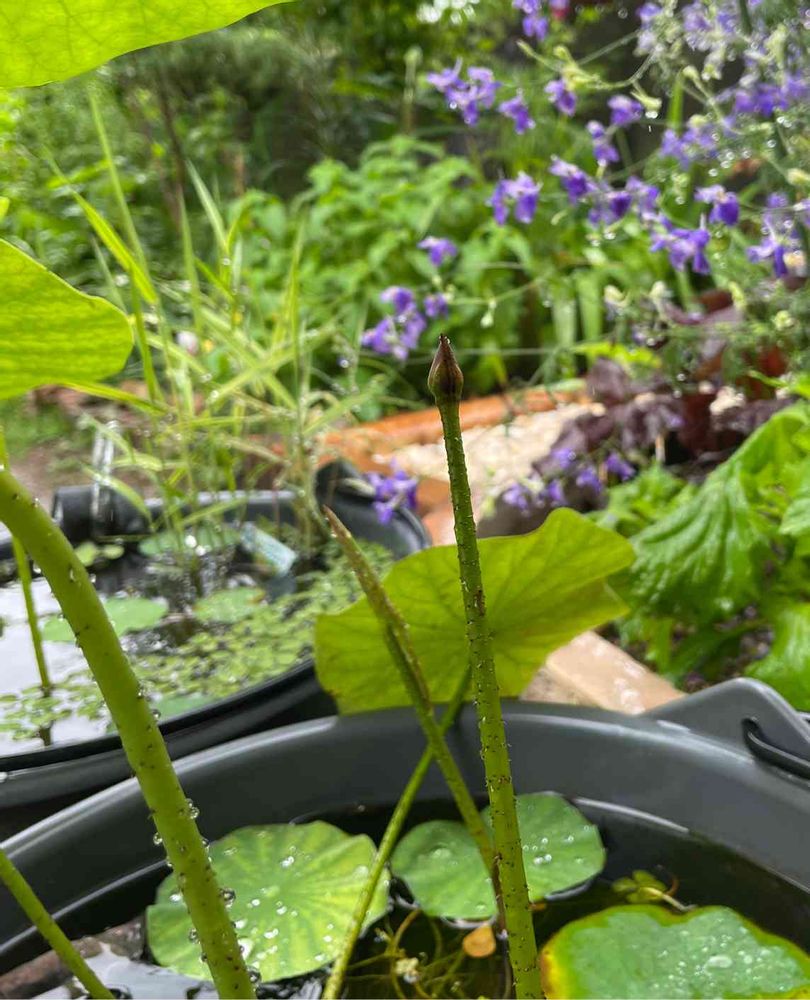 本格的に梅雨入りした雨の中、今期初の蓮の花芽が上がってきました🎵さて、品種はなんだったっけ…