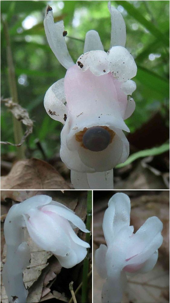 ⚫キリシマギンリョウソウでは、がく片が花びらと常に接するのに対し、ギンリョウソウでは花筒から離れていることが多い。