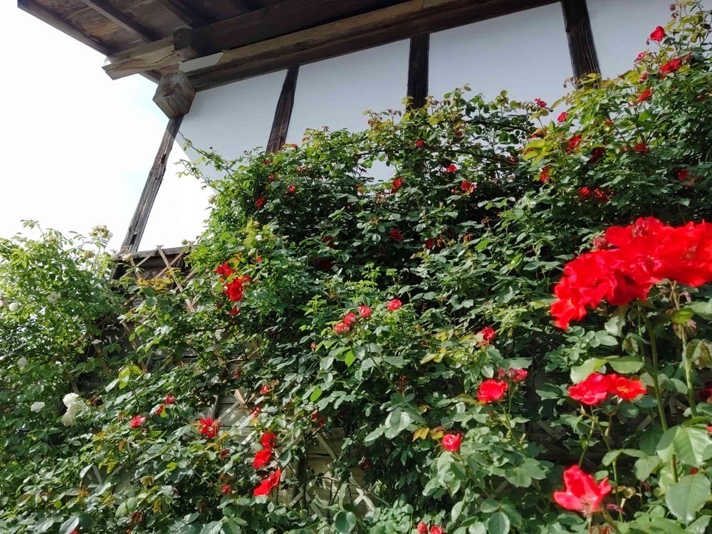 文化財の土蔵群の広い空きスペースにバラが植えられています。