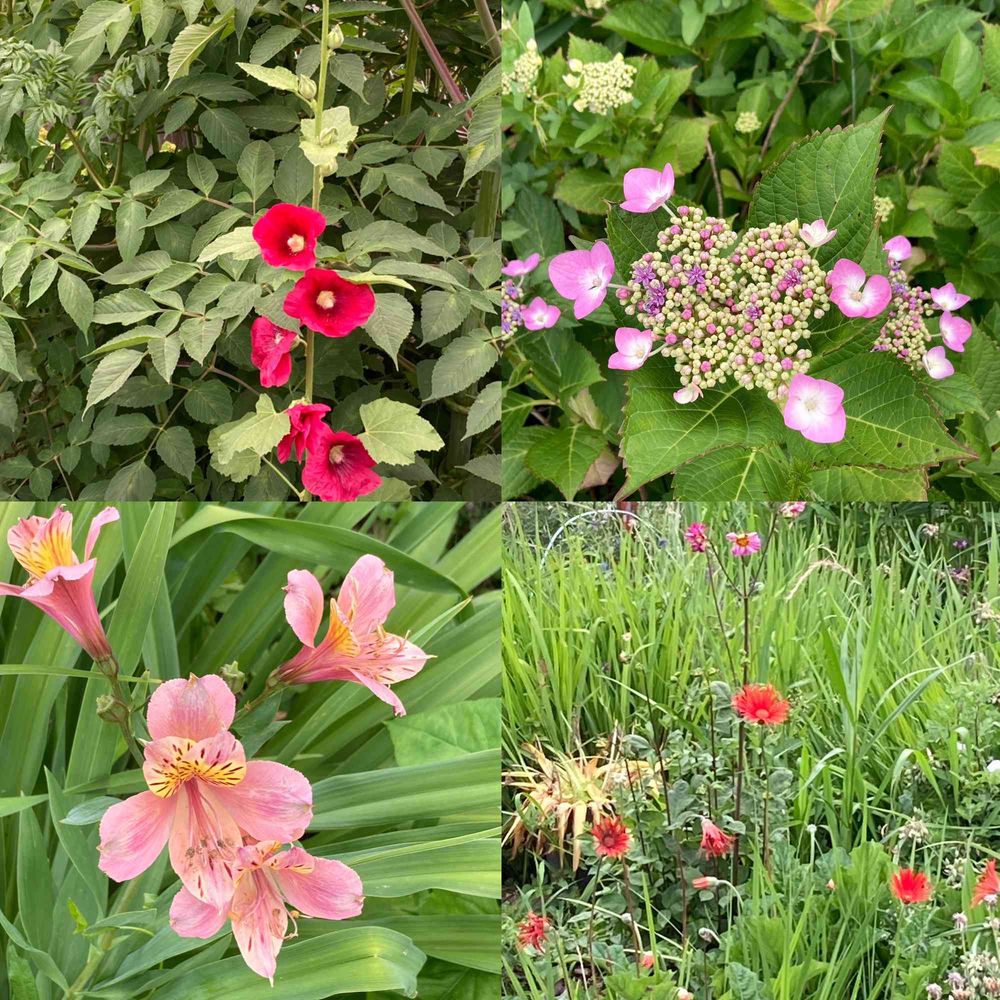 立葵、山紫陽花、アルストロメリア、ガーベラ(近所の家庭菜園にて)