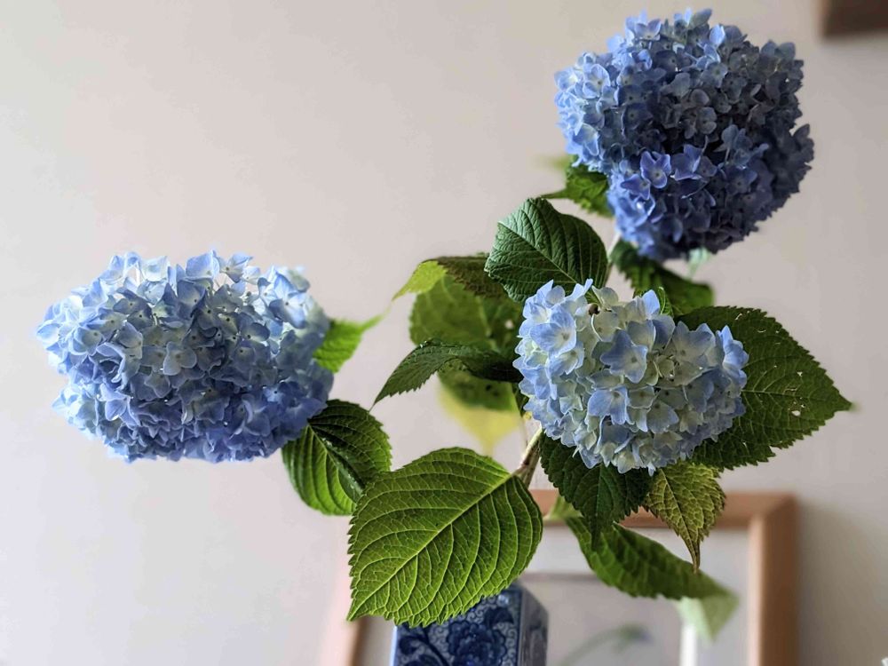 色づき始めた我が家の紫陽花もこの雨で大分腰曲がりしているところがあったので思い切って大輪のものを数本✂しました。立派なものは仏壇に供え小ぶりなものは玄関に。