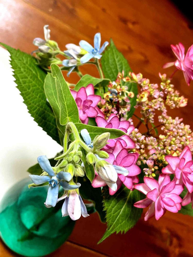 2023-6ー3(土) 吹き荒れる風の前に摘んだ紫陽花とオキシペタラム ブルースター 庭でもしっかりと咲いている