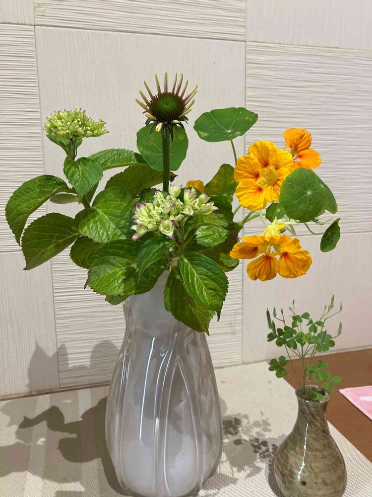 紫陽花もまだ色付いたばかり そばにいたかたばみさんもお迎えしました。