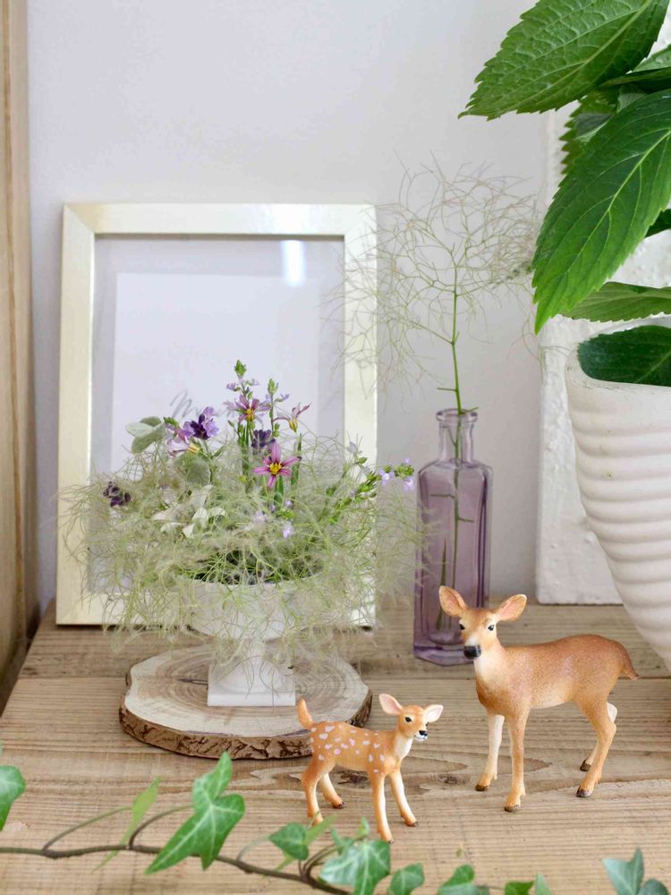 少しの空間で素敵に飾る! 花とグリーンのある生活にはラダーシェフルがおすすめ。