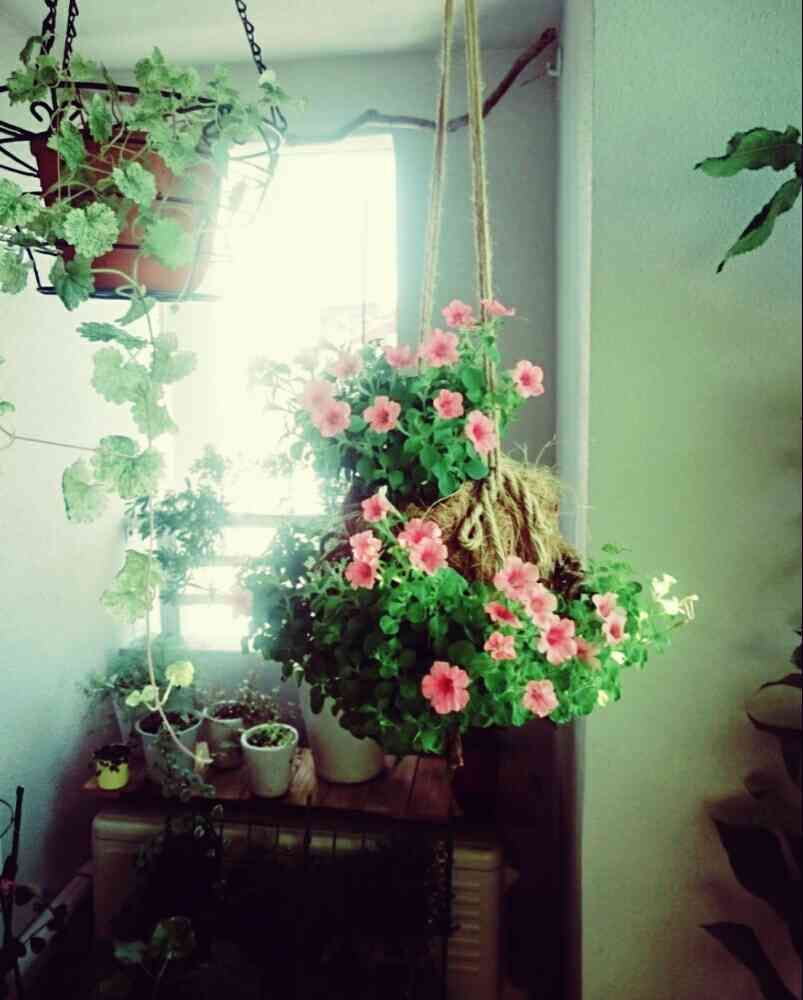 思いつきでつくったハンギングのサフィニアちゃんが咲き乱れました♪(`・∀・)ノイェ-イ!