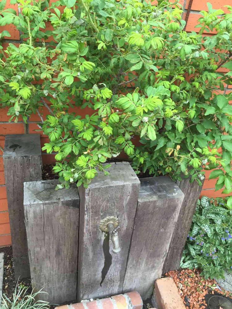 枕木の立水栓の中に土を入れてそこにクレマチスとバラのシュネーコッペ‼️