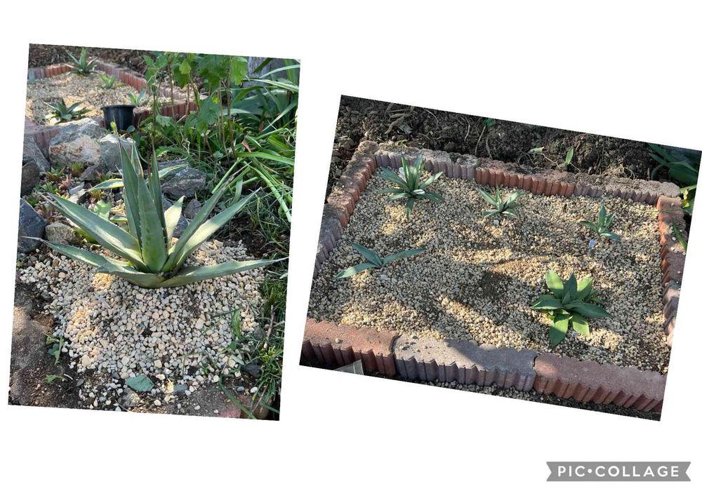 せっせと土を掘り、訳の分からん根っこの大群を引きちぎり、囲いを作って土を入れ、拗れてるアガベを地植えしました!