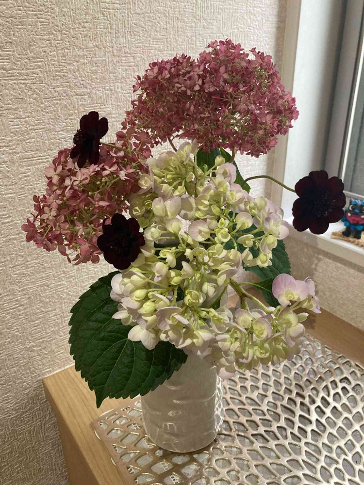それでも大きくなったアジサイが風や雨の水の重さで曲がったり垂れてしまったので、少しカットしてお部屋で楽しむ事にしました✂️
