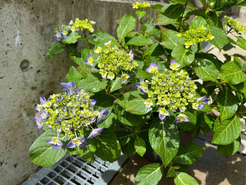 一年越しにアジサイが花をつけました!鉢植えで大きさをキープするには、また切り戻さないといけないんでしょうね…。