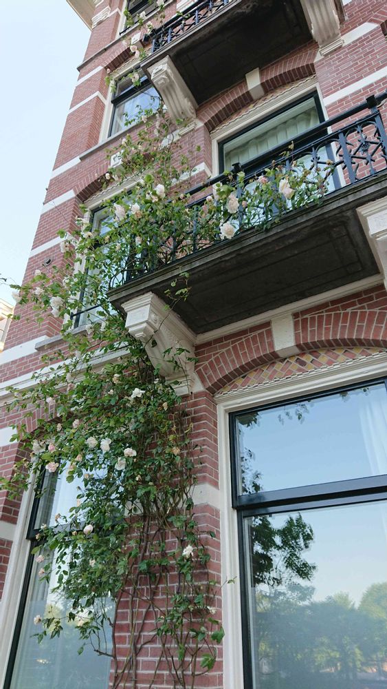 運河沿いの街並みはガイドブックなんかにも良く出てるところですが、アムステルダムを歩くならバラの咲く季節が個人的にはベストシーズンだと思ってます🥰バルコニーやサファードの装飾にバラが絡んで最高に可愛い😍これも個人の好みですが、煉瓦🧱の壁には真っ赤な🌹よりこんな薄ピンクのほうが似合う気がしてます😁