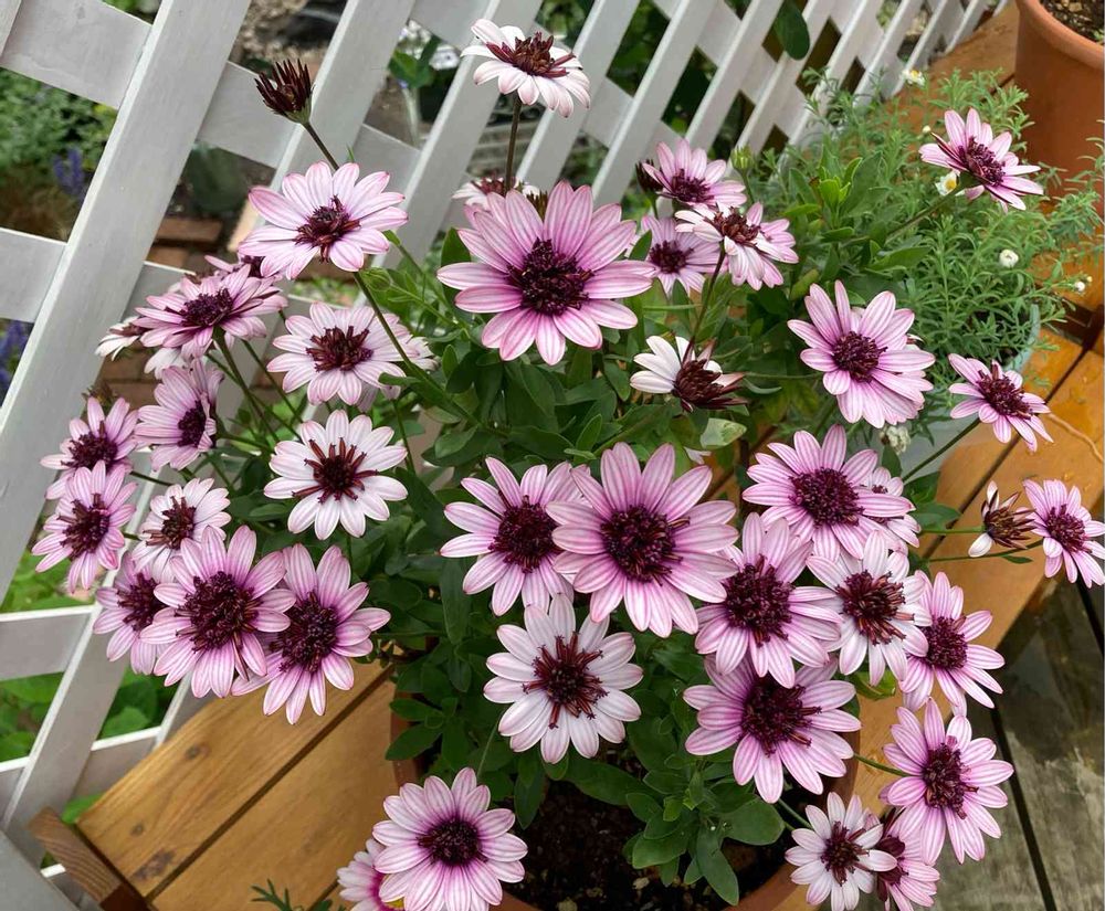 室内越冬して2年目のオステオスペルマム3D ベリーホワイト🌸北海道も雨でしたが多忙で何の対策もせず放置💦無事でしたー🥰