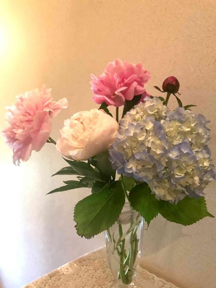 大好きなブルー系のアジサイのお花と優しいピンク系のシャクヤクがきれいです🌸🌿