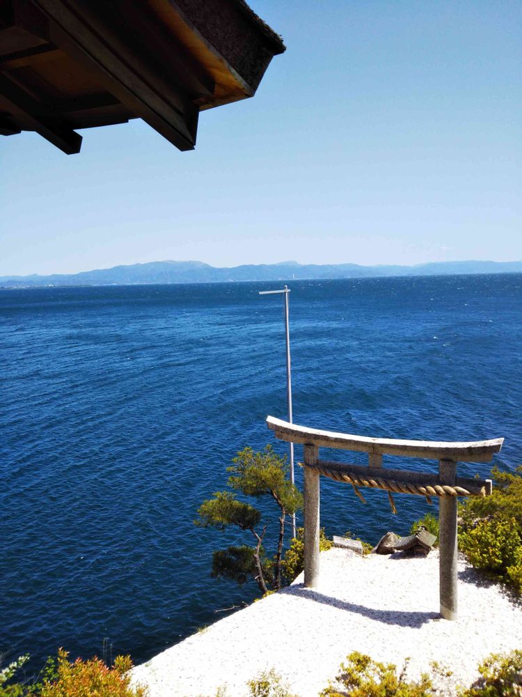 ⛩の辺りの土の色と海の青さの