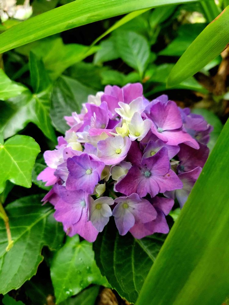 アガパンサスの大きく伸びた葉の下に紫色のアジサイが‼️