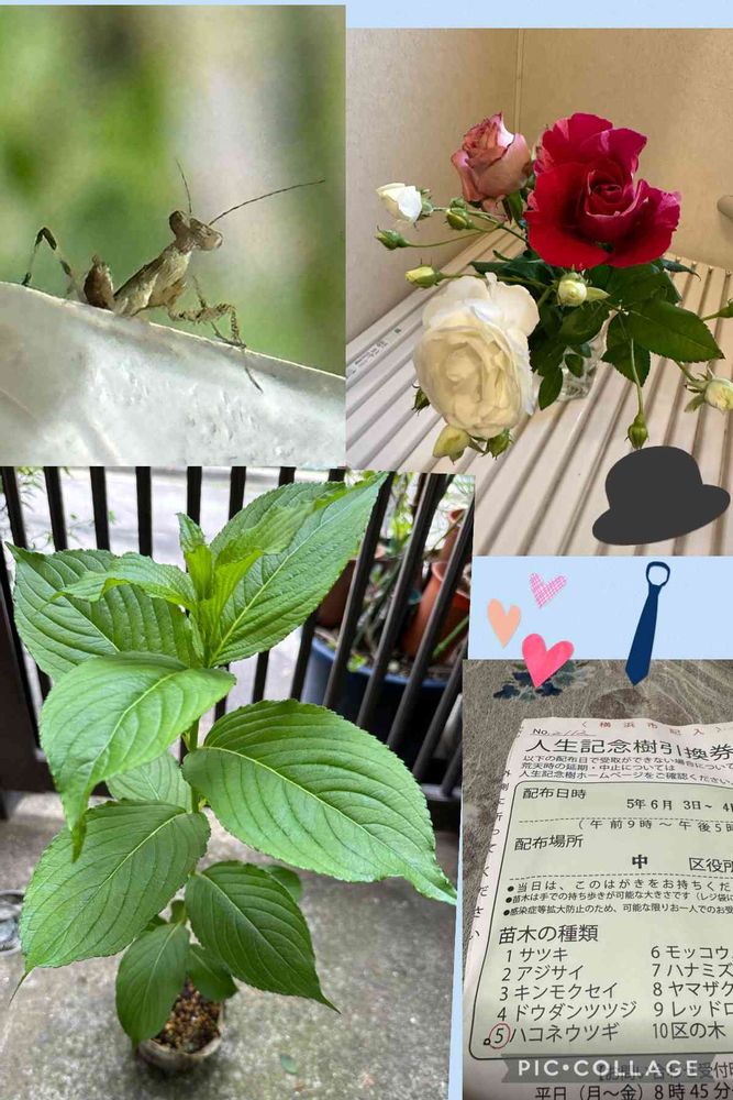 今日、主人の人生記念樹をもらいに2人で区役所に行って来ました。好きな木でいいと主人が言うので私の欲しかった箱根ウツギを予約してました。嬉しい😃。可愛いバラが安かったので3本買って、家に帰ると5ミリ位の小さな可愛いチビカマキリが門にいました。頑張って大きくなってね。