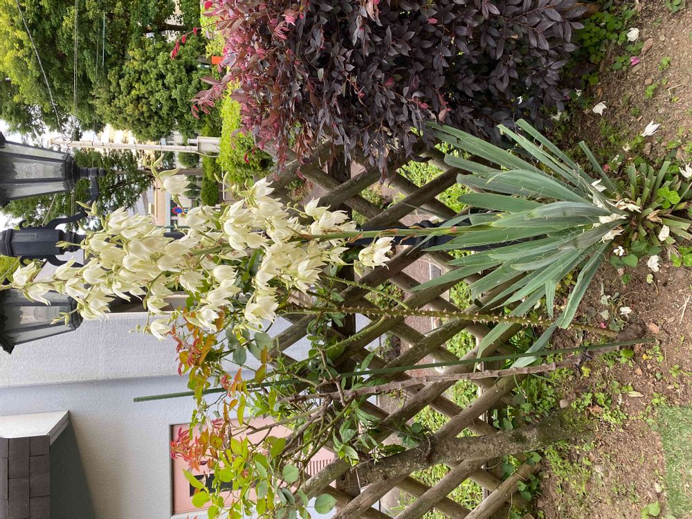 ユッカの様な花が咲き始めました。葉の色は白と赤っぽいのと両方咲きました。どなたかこの植物の名前を知りませんか?また、咲いた後のお手入れはどうすればいいのか教えていただくと助かります。よろしくお願いいたします。